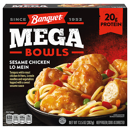 Banquet Mega Bowls Sesame Chicken Lo Mein frozen meal brings exciting flavor to your table. Featuring tempura white meat chicken fritters topped with a sweet sesame sauce and vegetables over Lo Mein noodles for a delicious sesame chicken Lo Mein bowl with a kick. This frozen chicken bowl offers 20g protein per serving to put hunger in its place. Enjoy Banquet Mega Bowls as flavorful frozen lunches or quick and easy frozen dinners any day of the week. Preparation of these ready made meals is easy. Just follow the instructions on the box to heat the frozen food in the oven for fresh-baked flavor or in the microwave for quicker cook time. Store the 13.5 ounce frozen meal in the freezer until you’re ready to enjoy. Banquet Mega delivers hearty meals that will keep bringing you back for more.