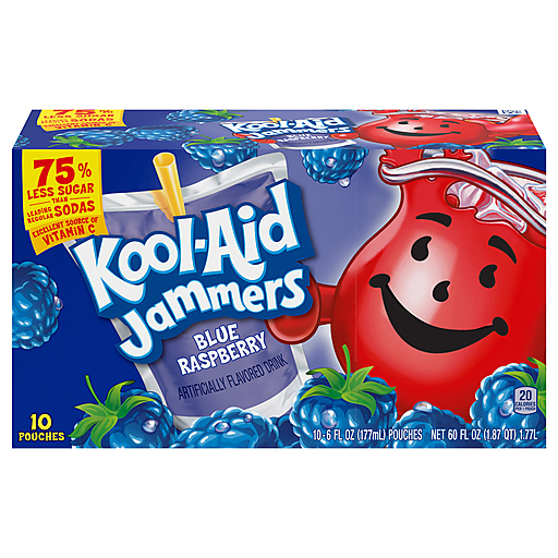 Kool-Aid Jammers Artificially Flavored Blue Raspberry Drink Pouches deliver fun with a sweet blend of raspberry flavor. Our delicious kids drink contains 75% less sugar than leading regular sodas (per 12 fl oz, this product 10g total sugar, leading regular sodas 40g total sugar), making it a great artificially fruit flavored drink for kids. Packed in a convenient drink pouch, kids can enjoy Kool-Aid at home, on the beach or during lunchtime. Each box of artificially flavored blue raspberry Kool-Aid Jammers contains ten 6 fluid ounce drink pouches. Enjoy flavorful fun made easy. Available in a rainbow of flavors!